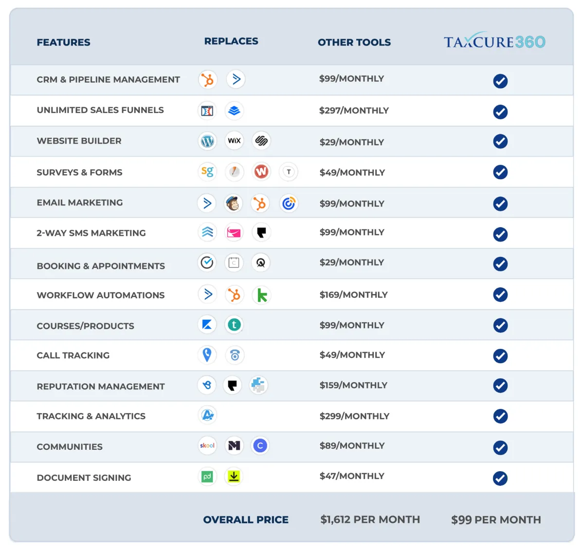 Stop paying for multiple subscriptions that don't talk to each other. TaxCure360 integrates the specialized functionality you need for a fraction of the cost.